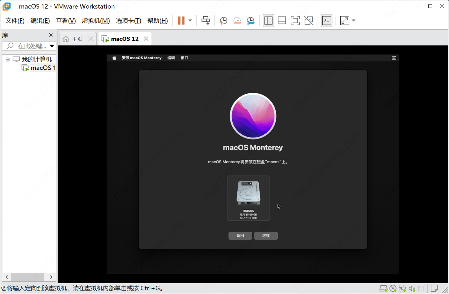 安装盘就选择我们刚才改名并抹掉的 macos 盘,然后点击“继续”开始安装;