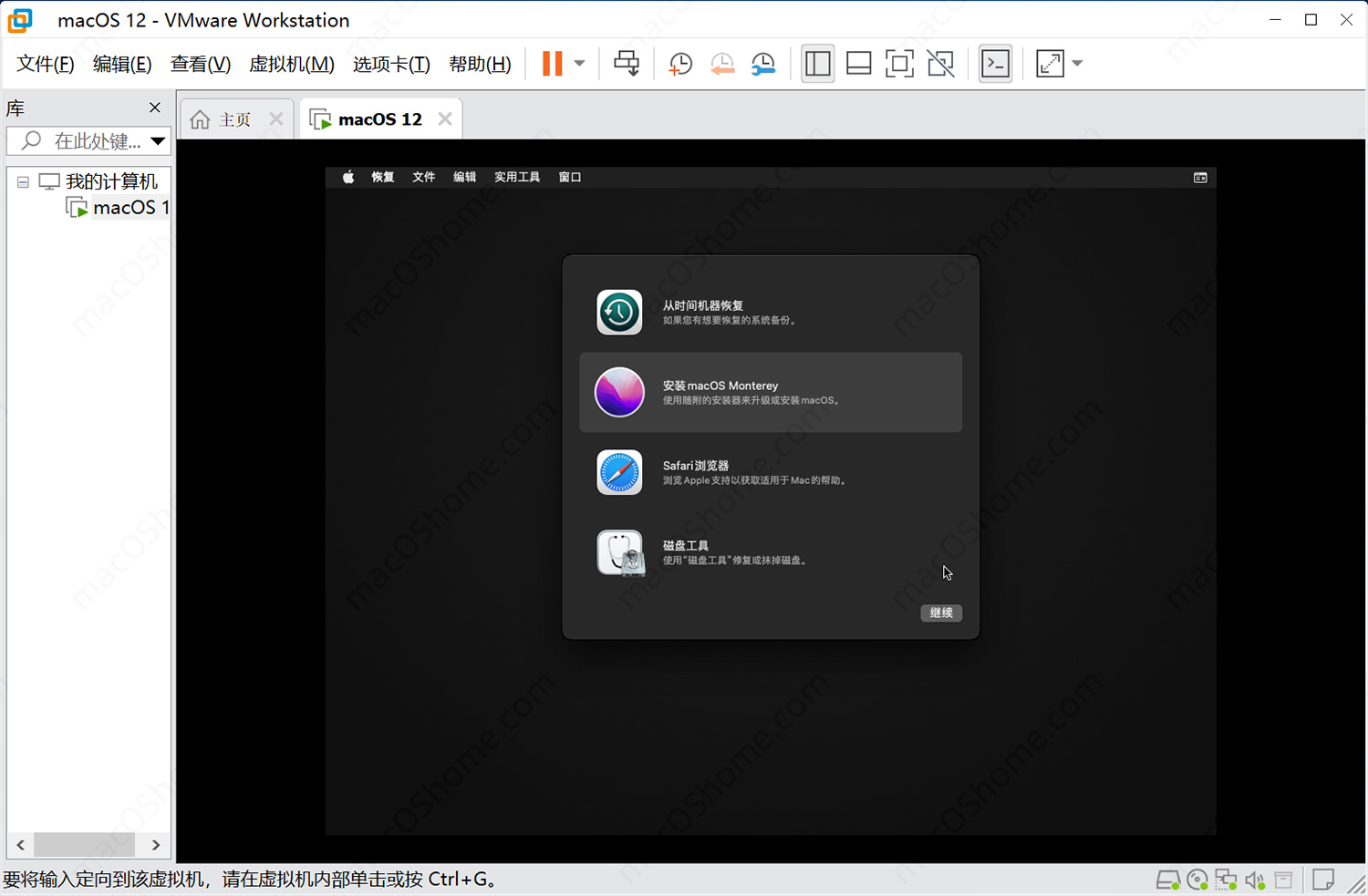 再回到实用工具界面后,选择“安装 macOS Monterey”,再点击“继续”按钮;