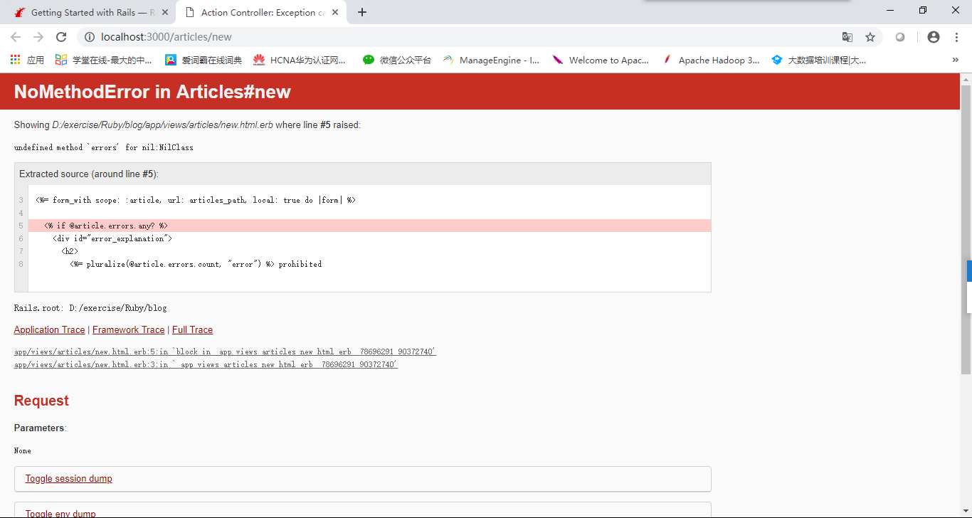 备注:在上文中并没有强调把controller的new方法加入@article = Article.new这行代码,在直接访问时出现如下错误,因为nil并不存在errors方法。
