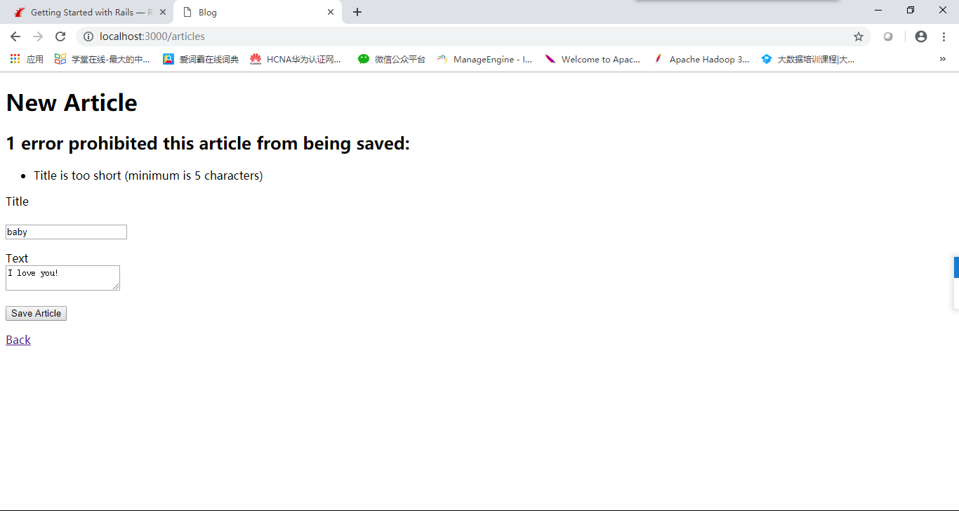 启动rails server后,访问 http://localhost:3000/articles/new,如果title不满足数据有效性条件的话,就会报错了。