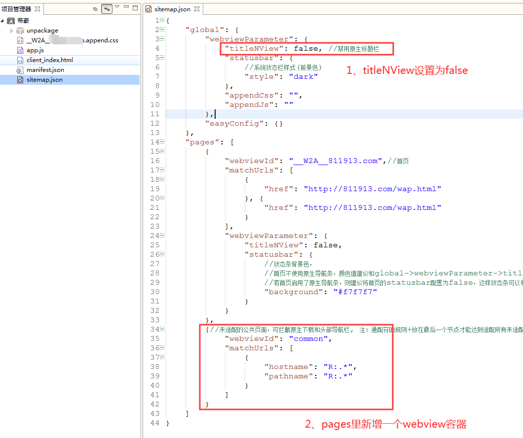 2、在sitemap.json的pages数组的最后,注意是最后(适配url规则为从上而下),配置一个webviewid为common的webview,来容纳所有会随机打开的窗口,进行你的操作。代码如下: