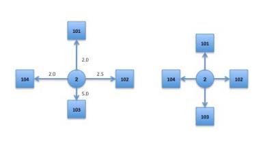 丢掉用户和项目之间的联系很容易,或者说我们可以直接忽略偏好值就可以办到。比如,你宁可考虑有没有看过一个电影,也不愿去给一个电影打分。换句话说,我们宁愿把数据改为“用户1和项目3有关系”,也不愿意写成“用户1喜欢项目103的程度为4.5”。下面是一个示意图,来说明二者之间的区别: