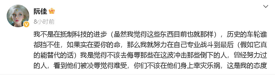 阮佳:对,我们可以有不同的立场和角度,每个人都可以有自己喜欢的东西,但自己呼吁就好了,没必要去道德绑架或者欺负别人。就目前看来,AI还远远谈不上取代人类,扫地机器人都还没取代保洁阿姨呢。