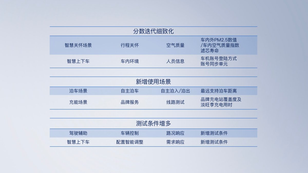 在原有的“新能源汽车智能化评测标准1.0”基础上,鲁大师对整体的智能化评分机制进行了完善,增添了更加丰富多样的评测需求,比如:新增了近 40 项细分功能打分体现,新增了代客泊车智能化测评、环境温度自适应表现等使用场景,针对部分车辆功能新增了一部分测试条件等。