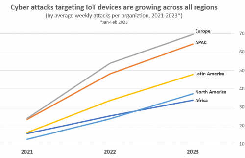 这种趋势在全球所有区域与行业中都有体现。欧洲是目前遭受物联网设备攻击最多的地区,每个机构平均每周遭受近 70 次此类攻击,其次是亚太地区(64 次),拉丁美洲地区(48 次)和北美洲地区(37 次;与 2022 年相比增幅最 大,高达 58%),非洲地区每个机构平均每周遭受 34 次物联网网络攻击。