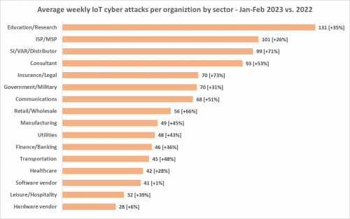 教育和研究部门针对物联网设备的攻击次数以前没有激增,每个机构平均每周遭遇多达 131 次攻击,是全球平均水平的两倍多,比前一年骤增 34%。其他行业遭遇的攻击次数也显著增加,与 2022 年相比,大多数行业所遇攻击次数都经历了两位数增长,如下表所示: