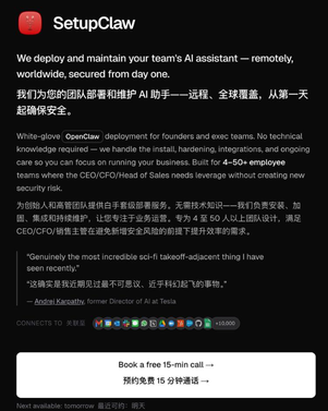 海外更夸张。一个叫SetupClaw的平台直接挂出了价目表:托管安装3000美元,远程配置含Mac mini硬件5000美元,旧金山湾区上门安装6000美元。这是个真实运营的生意,有客户评价,有创业圈大V背书。创始人声称年入百万美元,这个数字有多少水分不好说,但它成功制造了一种叙事:帮人装AI也能财务自由,你不来吗?