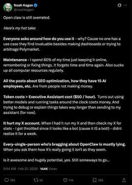 “每个吹嘘OpenClaw的人多半都在撒谎。当你问他们实际使用情况时,真相往往与表面光鲜截然不同。它既惊艳又潜力巨大,确实如此。但仍有提升空间……”
