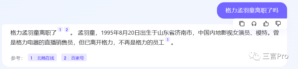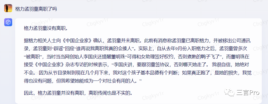 而文心一言给出的答案是孟羽童没有离职。