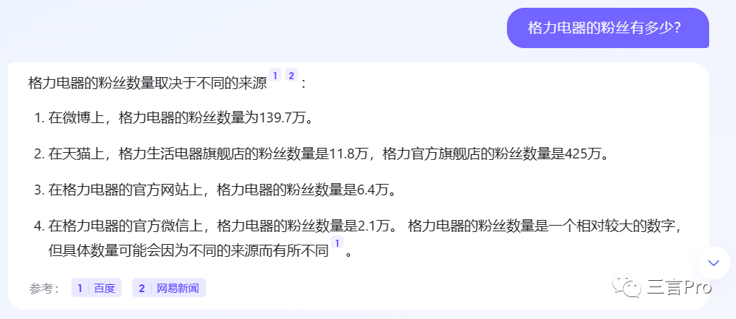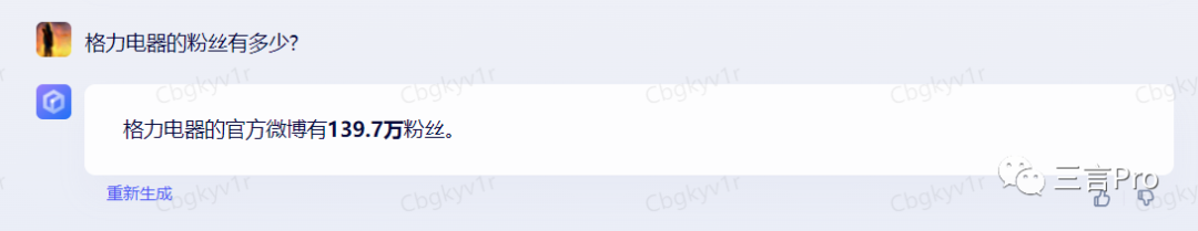 而文心一言给出的答案只有格力电器官方微博139.7万。