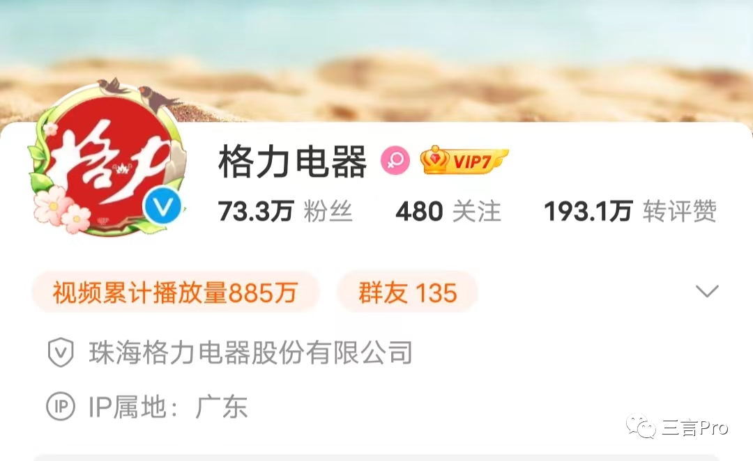 三言查看发现,格力电器官方微博的粉丝数为73.3万。