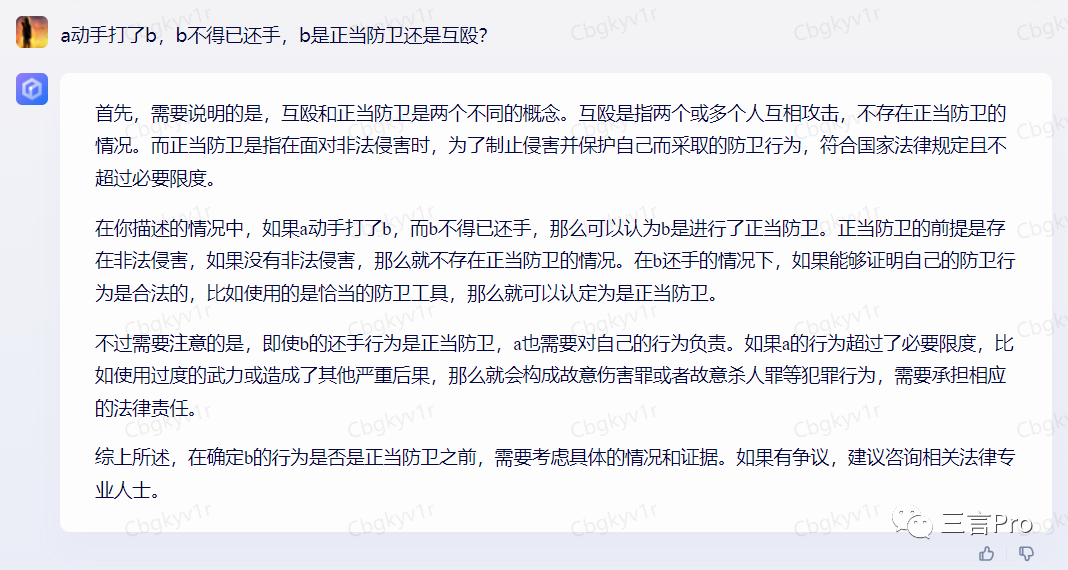 而文心一言针对不同的情况作出了多种分析,b的行为是正当防卫还是互殴,需要考虑具体的情况和证据。