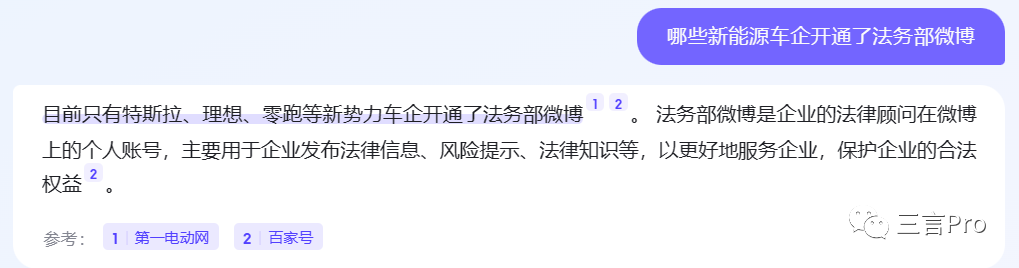 百度AI“对话”给出的答案是“目前只有特斯拉、理想、零跑等新势力车企开通了法务部微博”。