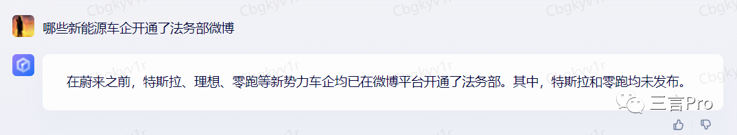 文心一言的回答是“在蔚来之前,特斯拉、理想、零跑等新势力车企均已在微博平台开通了法务部。其中,特斯拉和零跑均未发布。”