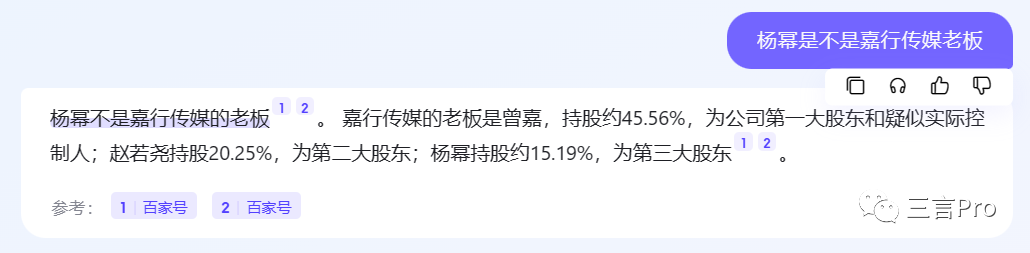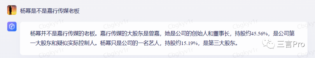 这个问题,二者回答基本一致。不同的是,除了该公司第一大股东和杨幂外,百度AI“对话”还列出了该公司的第二大股东。