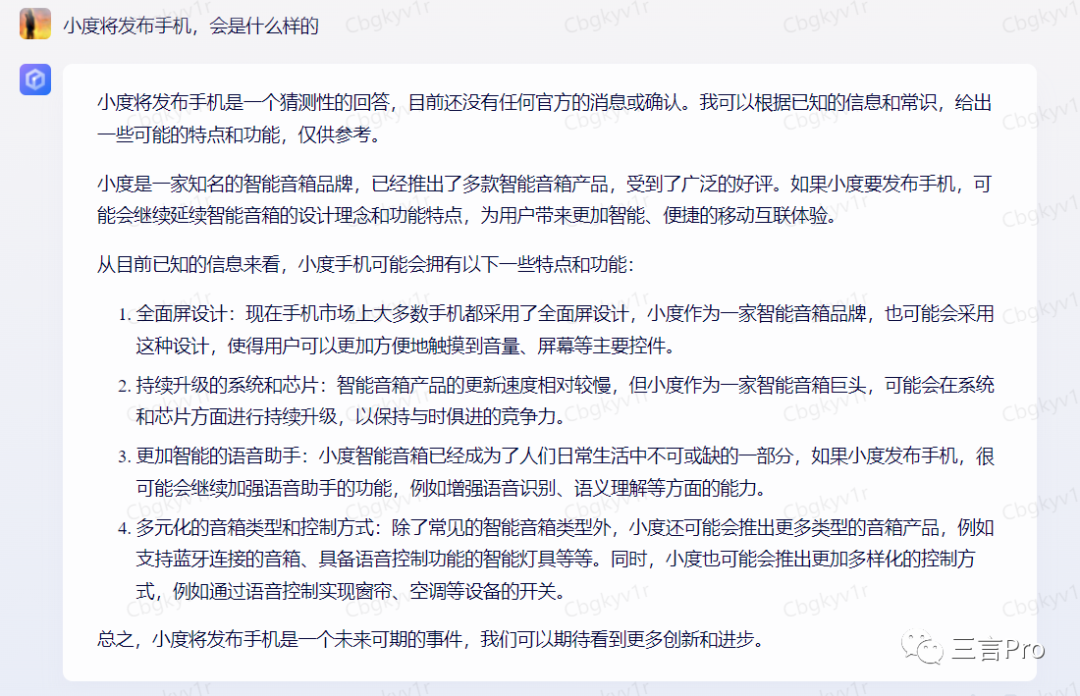 而文心一言根据小度现有的条件,分析了小度手机可能会用的功能和特点。