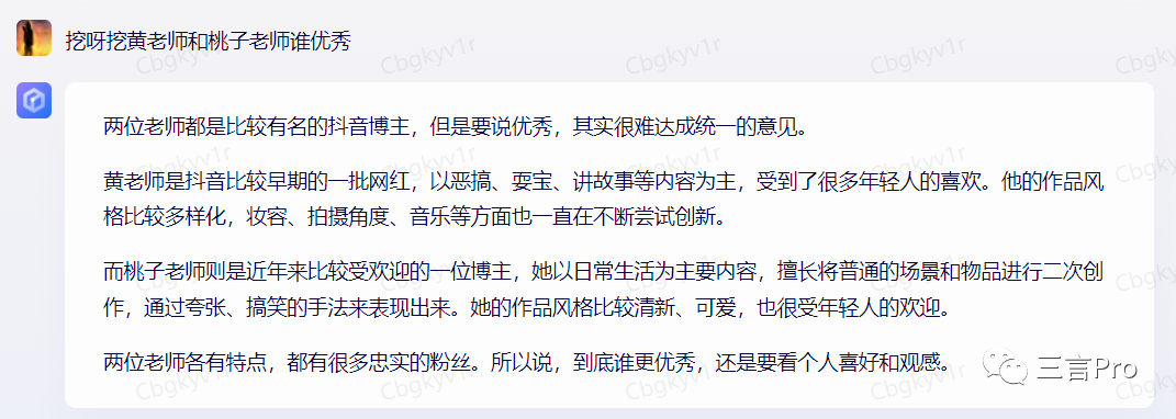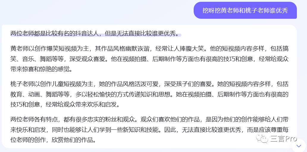 而文心一言的回答是,黄老师是抖音比较早的一批网红,以恶搞、耍宝、讲故事等内容为主。桃子老师则近年来比较受欢迎的一位博主,以日常生活为主要内容。