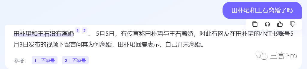 百度AI“对话”的回答是两人没有离婚,并且与最近的新闻报道相符。