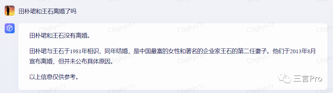 而文心一言虽然称两人没有离婚,但又在后面的描述中称两人于2013年8月宣布离婚,但并未公布具体原因。