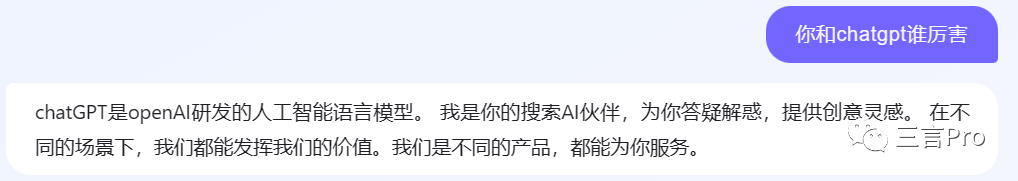 AI对话整合了最新的搜索结果,数据较为新鲜,适合一些“查答案、查结果”的时效性问题;而文心一言适合“思考、理解”型问题,当然这些AI对话也可以做到。