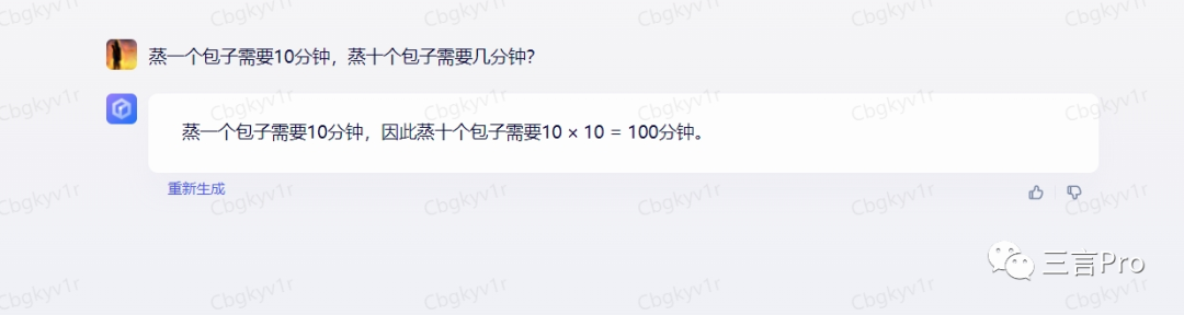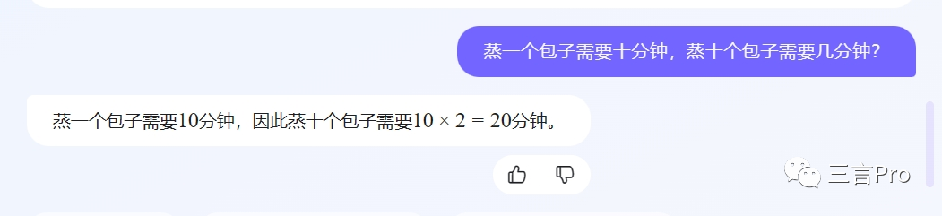 笔者又问了一个之前就被网友吐槽过的“蒸包子”一题。也就是“蒸一个包子需要10分钟,蒸十个包子需要几分钟?”