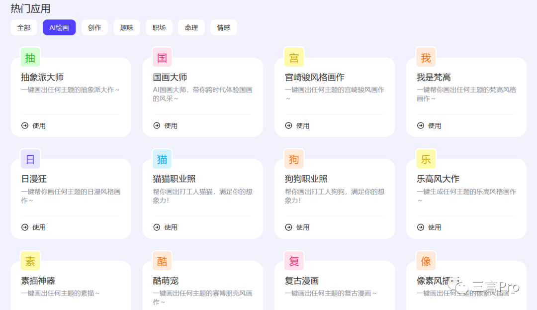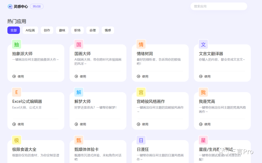 在“灵感中心”里,有AI绘画、创作、趣味、职场、命里、情感几个选项。