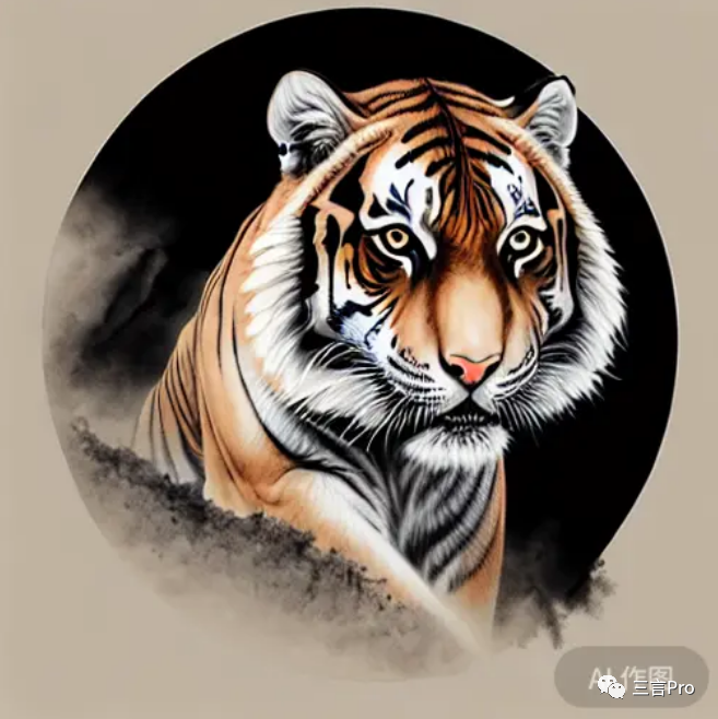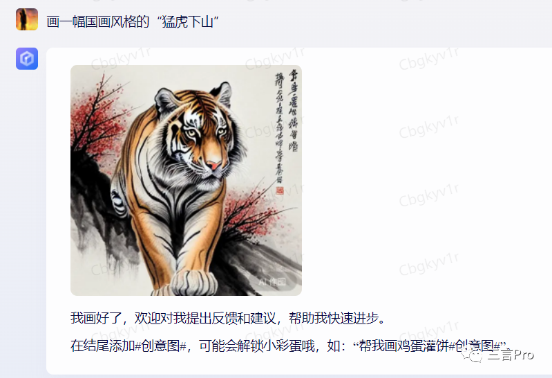 笔者又选取了百度AI“对话”灵感中心的“国画大师”,让其画一幅“猛虎下山”,作品如下: