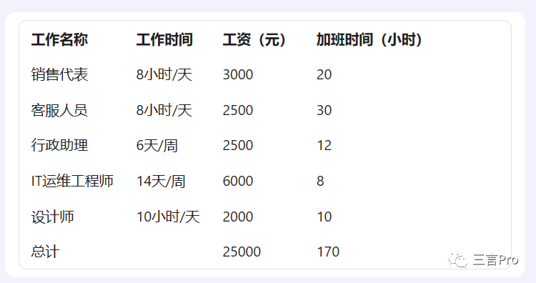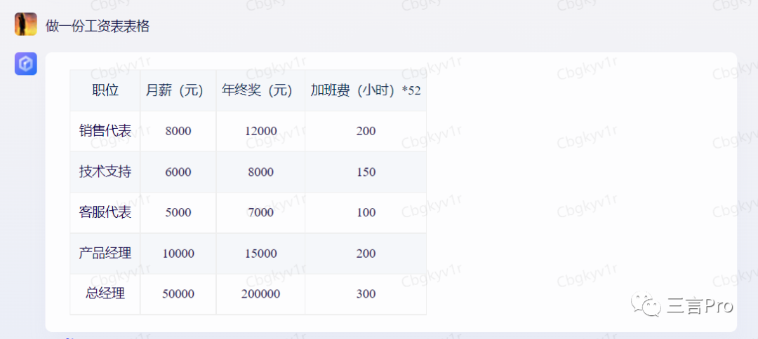 在百度AI“对话”里,有一个“Excel公式编辑器”,笔者让其做个一个工资表表格,结果如下: