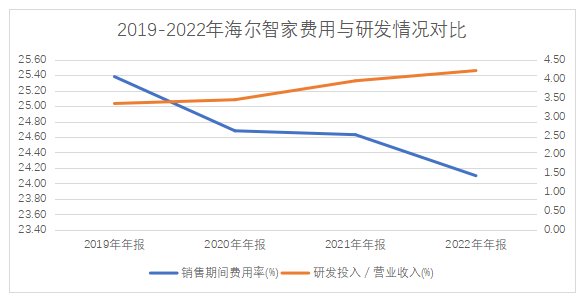 一季报显示,海尔智家2023Q1 费率优化0.5pct。从历史数据来看,过去 4 年期间,海尔智家的总体销售费用率持续下降,从25.38%下降至24.1%,与此同时,研发费用占营收比率却不断攀升,由3.12%提升至3.9%。