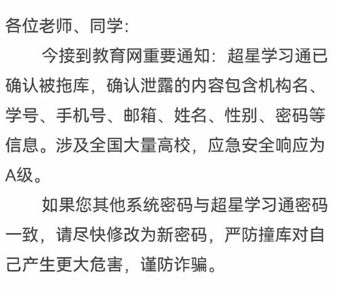 「如果您其他系统密码与超星学习通密码一致,请尽快修改为新密码,严防撞库对自己产生更大危害,谨防诈骗。」