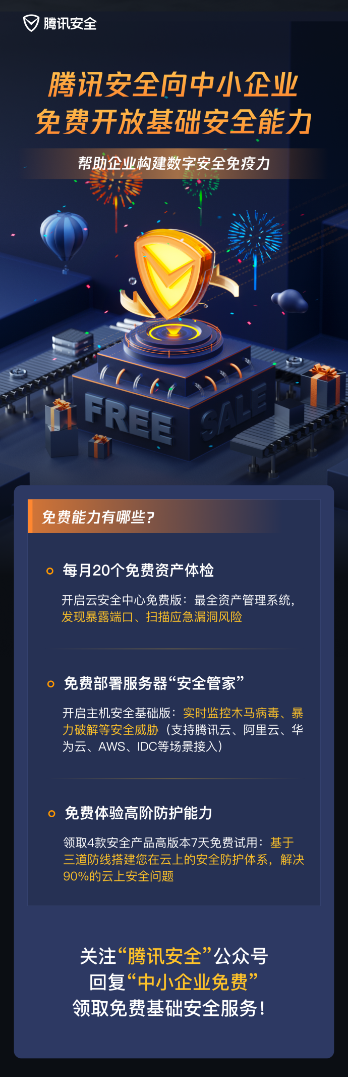 为帮助中小企业解决安全防护难题,4月14日起,腾讯安全将免费开放部分基础安全能力,助力云内外中小企业筑牢安全防线,构建企业数字安全免疫力。中小企业可免费获得腾讯安全推出的三大福利: