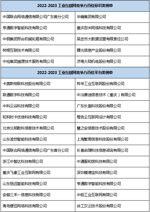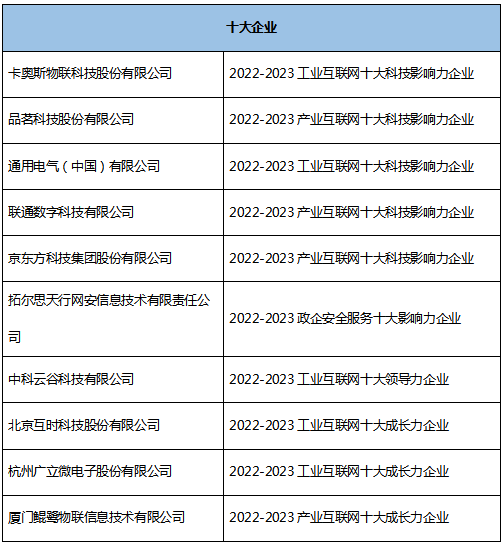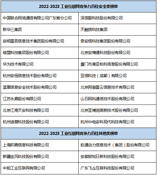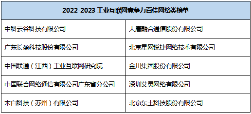 聚焦工业互联网,释放数字经济新动能。我国工业互联网创新发展持续迈出坚实步伐,有力推动了制造业数字化、网络化、智能化转型,有力推动了经济高质量发展,并取得了一系列阶段性、标志性、引领性成果。为进一步促进产业结构调整和转型升级深入推进,持续释放积极效应,抓住全球产业结构和布局调整过程中孕育的新机遇。 2023 年 5 月 10 日,由赛迪网发起,联合《数字经济》杂志社、赛迪数通等机构调研并发布的《2022- 2023 工业互联网竞争力百佳/互联网产业创新优秀成果》正式揭晓。本次入选的工业互联网竞争力百佳由六大类组成,分别是工业互联网网络类、标识类、平台类、应用类、安全类和其他类,互联网产业创新优秀成果分设标杆成果和单项成果两大类。
