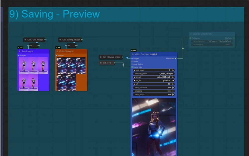工作流程被巧妙地分成了几个小组,每个小组都有其独特的功能,从输入设置到输出保存,一目了然。