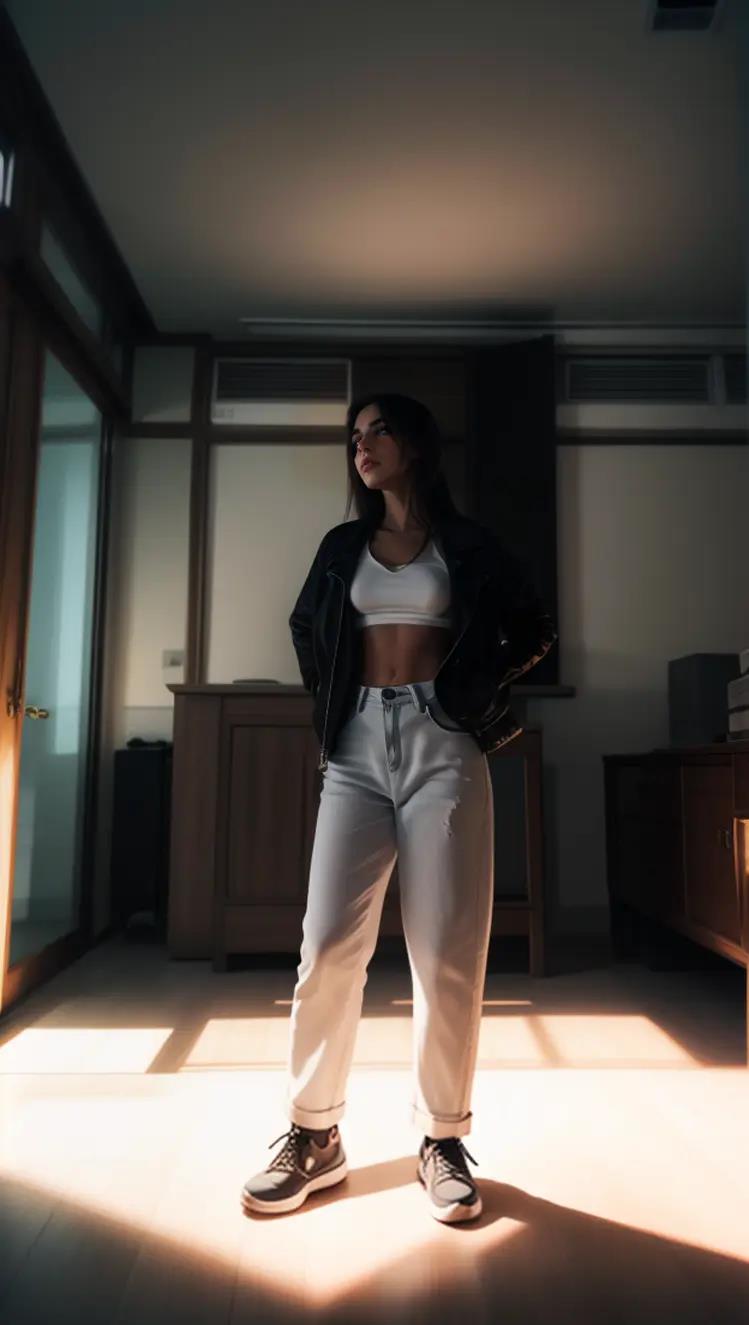 [1girl、阳光、日落、白衬衫、黑色短裤、室内、房间]