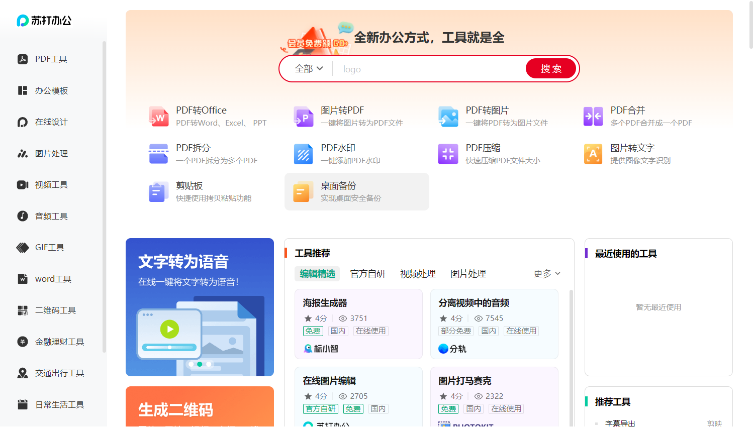 当你进入 360 安全卫士极速版,在上方搜索框内搜索“苏打办公”,便可进入其页面。在此页面中,办公模板、在线设计、视频处理、音频处理等功能一应俱全,堪称办公效率神器集合地。而且,它不仅具备职场人常用的办公属性功能,还集合了交通出行、日常生活等实用工具,照顾到了现代人的各种需求场景。