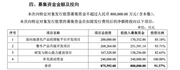 据北汽蓝谷发布的公告显示,此次定增拟非公开发行股票募集资金不超过 80 亿元,用于面向场景化产品的滑板平台开发项目、整车产品升级开发项目、研发与核心能力建设项目及补充流动资金。