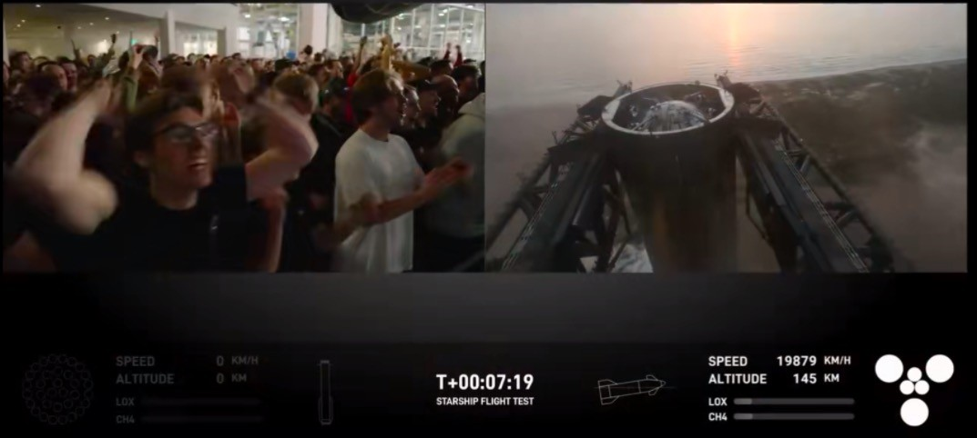 距离星舰发射6分多钟,第一级超重型火箭成功被发射塔架上的机械臂夹住。这是SpaceX第一次尝试回收星舰的一级超级重型助推器,并成功了。