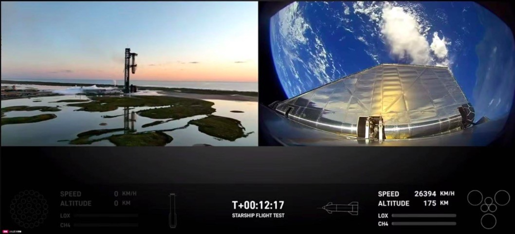 据悉,接下来,星舰第二级将继续飞行(右侧画面),预计会在印度洋受控溅落。