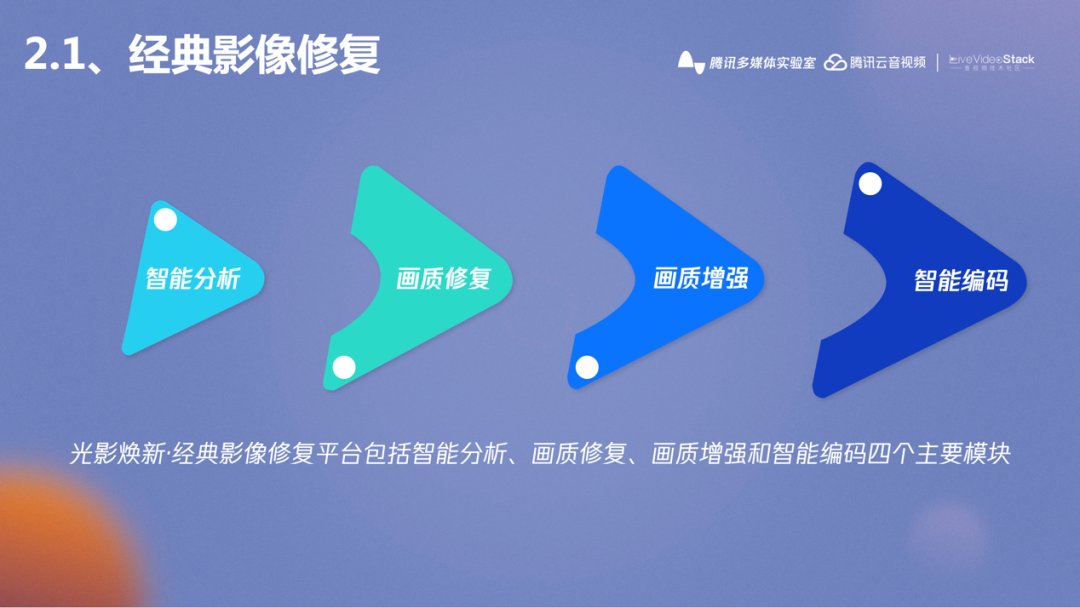 在经典影像修复的过程中,腾讯多媒体实验室积累了深厚的技术和实践经验,形成一套较完整的基于AI的影像修复技术流程,主要分四个大的模块,包括智能分析、画质修复、画质增强和智能转码。