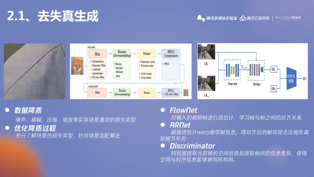 以去失真生成模型研究为例,首先去失真生成模型解决了什么问题?在经典影像中不同于常见的视频,比如左图放大的画面,因为受限于经典影像拍摄的年代、拍摄硬件、存储等因素,导致画面存在严重破坏画质的问题,比如噪声、编码失真、模糊等等问题,之前的研究过程是先进行去压缩失真、降噪等处理再通过后面的超分辨率、细节增强等算法增强细节,但后面发现在前面进行去压缩失真和降噪等处理已经把细节都丢失了,后面的超分、细节增强很难恢复细节恢复,基于这个问题开发了去失真生成模型,主要解决的是在去压缩失真的同时对细节进行增强和生成,只有两个能力在一个模型里才能在去掉失真的同时生成更丰富的细节。