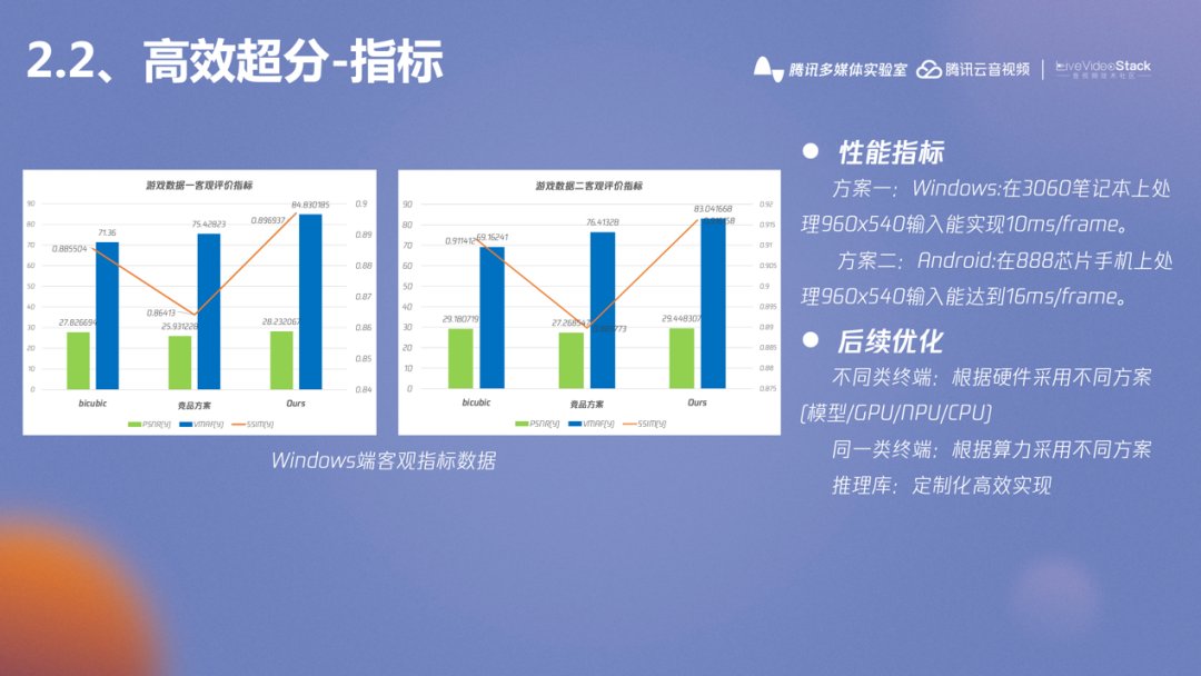 经过多次优化,在windows和android上测试了一些不同结构的方案,基本上能达到超分后1080p/30fps的要求,左边的客观指标是在windows端对比传统bicubic和某个竞品的方案,从vmaf/psnr/ssim指标上都显著优于竞品和传统方案,当然这些客观指标其实并不能反映主观质量。