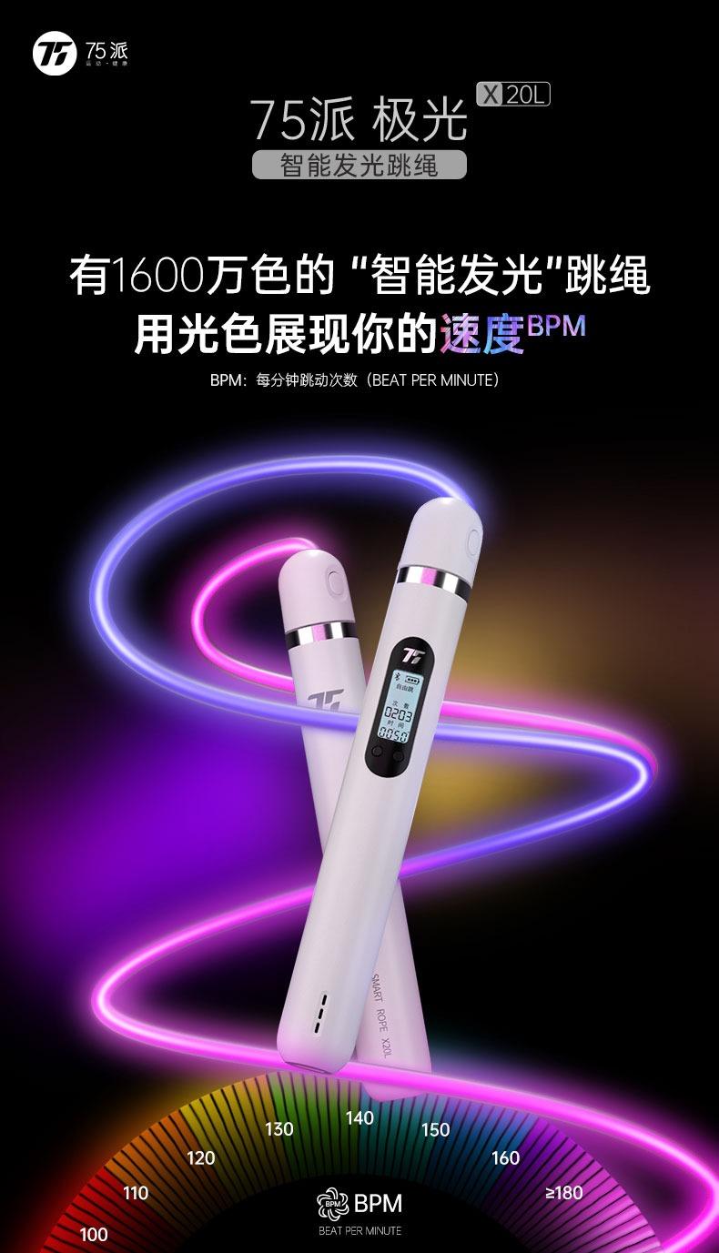 75 派最 新推出的极光X20L智能发光跳绳,集成了包括智能运动组件、数码运动发光组件以及运动计数算法在内的三大智能黑科技,让发光跳绳可以随着你的速度而变化。当跳绳速度从 0 到 100 次/分钟,发光跳绳会呈现红色,100- 120 次/分钟变为橙色,之后每增加 10 次/分钟就逐步从绿色变为青、蓝、紫色,超过 180 次/分钟,发光跳绳会自动解锁 7 中颜色光线的快速切换特 效,也就是极光X20L智能发光跳绳独有的“极光”模式,为热爱跳绳的你带来时尚、个性、智能的全新运动体验!