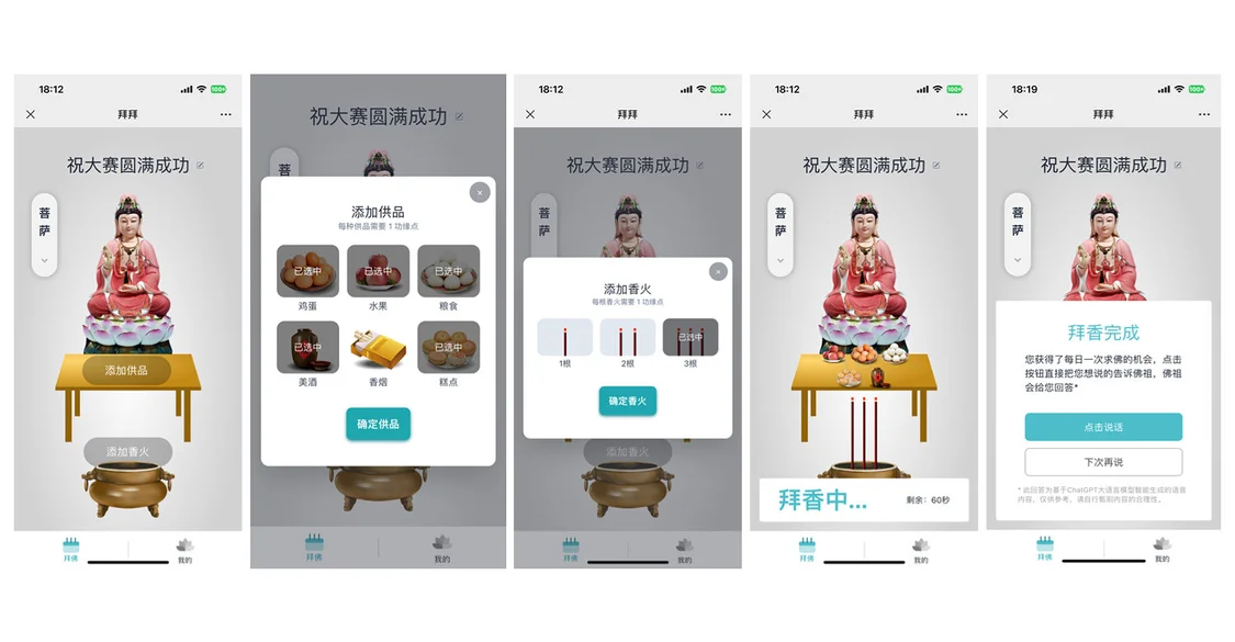 拜拜是一款求神拜佛应用,让用户可以在任何时候与神佛交流。除了常规的选择神佛、摆放供品、祭拜之外,信众每天可以获得一次与神佛交流的机会。借助 ChatGPT 对话能力,模仿神佛语气进行对话,可以使用户获得心灵的慰藉。
