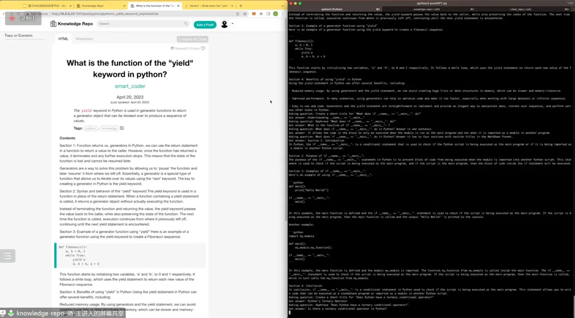 knowledge-repo 是一个基于 AIGC 的知识共享平台,借助 AIGC 可快速生成高质量答案,提高回答的准确性和全面性,处理大量相似问题,促进知识分享。通过这次 Hackathon 证实:只需 3 个人一个月一百万美元,就可以用 AIGC 再造一个 Stack Overflow。