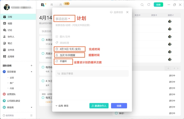 我们先把本月需要做的事情捋出来,创建成一个个事项,每个事项都会带有日期、时间提醒和循环功能。