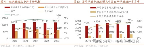 报告表示,全球游戏市场及其中手游市场的规模在经历了 2022 年的下滑之后,于 2023 年企稳,同比分别增长6%、2%,手游占比自 2019 年来维持在50%~55%左右。仅看海外手游市场方面,2022- 2023 年规模有所下滑,但中国自研手游海外收入在2019- 2022 年保持增长,仅在 2023 年下滑1%,且下滑幅度低于海外手游市场的5%,促使中国自研手游海外市占率进一步提升,从 2019 年的17%提升至 2023 年的27%。