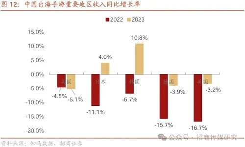 手游出海收入主要地区企稳,日韩回升。根据伽马数据, 2023 年中国出海手游在重要地区市场的收入有所企稳,美国下滑5.1%,下滑幅度相较 2022 年变化不大;日韩重回正增长,同比分别为4%、10.8%;德国、英国则是明显企稳,下滑幅度均收缩10pct以上,降至不到4%。报告认为,主要市场企稳回升有利于出海游戏增长。