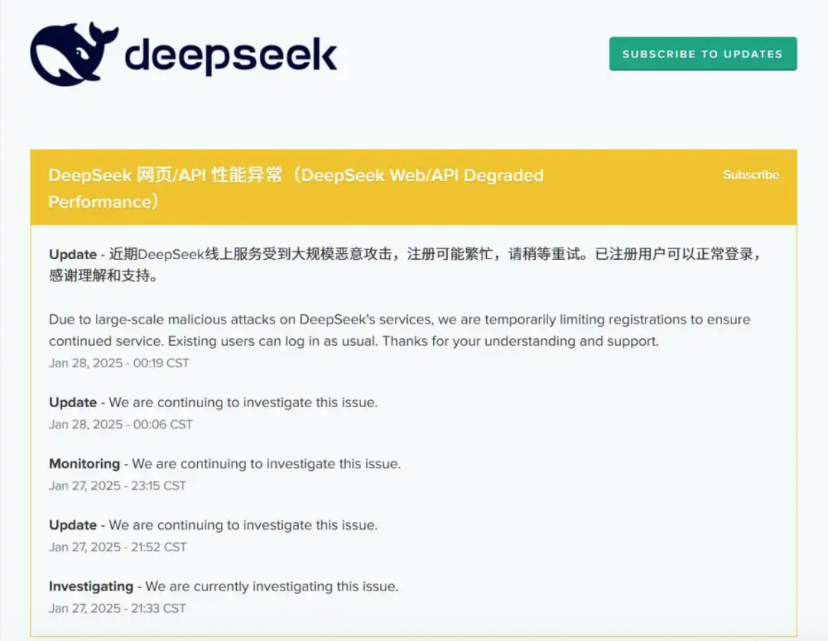 1月28日凌晨,DeepSeek于服务状态页面公告称,近期DeepSeek线上服务受到大规模恶意攻击,注册可能繁忙,请稍等重试。已注册用户可以正常登录,感谢理解和支持。