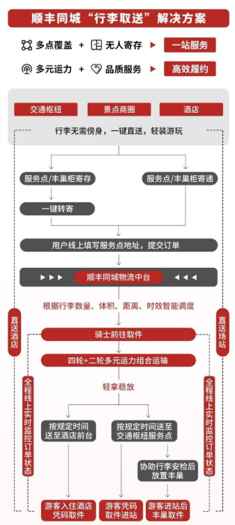 为方便游客快速寄送,顺丰同城与场站、景区等场所合作设立多个服务点,并联合丰巢为游客提供 24 小时无人寄存、转寄,线上一站式服务;在配送环节,物流中台根据行李的数量、体积、距离和时效进行智能调度,依托“商圈+全城”弹性运力网络与“四轮+二轮”多元运力组合,保障各类行李稳妥准时送达。专业骑士全程轻拿稳放、呵护行李安全,用户也可在线上全程查看订单状态。