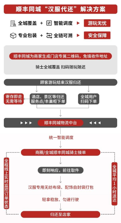 然而,在汉服体验结束后,归还汉服时,游客常常面临门店位置难找、往返交通耗时、费用高昂等不便。基于此,顺丰同城已在西安等地推出的“汉服代还”解决方案,通过优化骑士覆盖、汉服包装等关键环节,游客扫码下单,即可享受“全城平均 1 小时归还”的便捷服务。